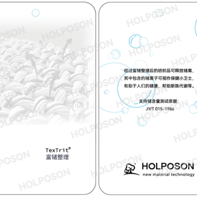 富锗整理剂HOLPOSON® GE是本公司采用微胶囊技术制成的功能型整理剂,后整理高温定型能使富锗整理剂HOLPOSON® GE牢固的结合在纺织品上,使其具有持久的释放功能。