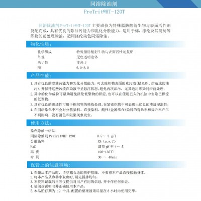 Greaseless 是高浓度染色精炼同浴除油精炼剂,具有良好的脱脂乳化能力,对化纤类纤维的矿物油和纺丝油、织造油剂等都能充分地进行乳化、分散,并可以避免形成浮油及浮蜡;是去除各种油污、斑渍的理想助剂,即使添加至连续精练浴中也能达到目的。适用于添加至酸性~碱性染浴中进行染色同浴加工。