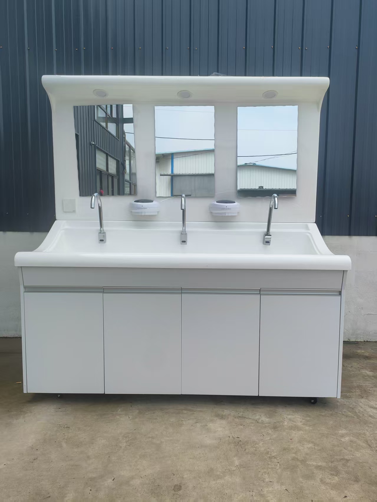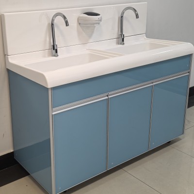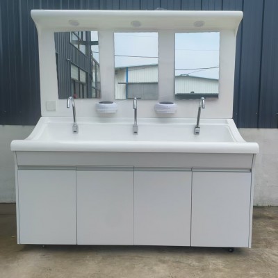 高分子洗手池材质特点:采用高分子材料一次吸塑成型,出水方式有:感应式、膝控式、脚踏式和手动开关,一台洗手池可客户要求选择单一出水方式或多种出水方式。洗手池分高背和低背,高背总高度1800mm,配有美容镜,照明灯,皂液器,可按客户要求配置烘手器和热水器。低背板无配置。