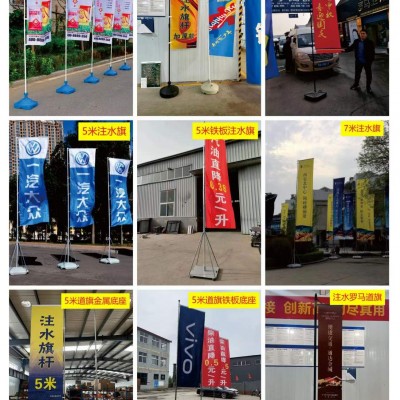 注水旗出租:提供 5 米注水旗杆租赁服务。3 米注水旗底座可注水 12 斤左右,底座轻巧,便于更换放置地点,配合可随风旋转的回旋头,可抗七级大风。旗杆高度可随意调节,横杆高度也能随旗面大小灵活调整,拆卸、更换方便快捷。