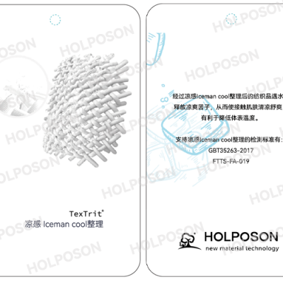 HOLPOSON®ICEMAN COOL也叫酷冰侠®是一款专门针对纺织品开发的凉感功能整理剂,是由我公司的东华大学博士团队开发的以木糖醇,赤糖醇,丝蛋白为主的接触吸湿凉感整理剂。适合用于天丝,冰丝,棉,涤纶等各种纤维的后整理。其作用原理:凉感整理剂HOLPOSON® ICEMAN COOL处理在面料表面的木糖醇遇水发生吸热反应,释放凉爽因子从而使接触到凉爽因子的皮肤清凉舒爽,另外其所含有的丝蛋白成分具有良好的保湿功能,清凉保湿双组合使得人们在炎炎的夏日有降温防护的可能。