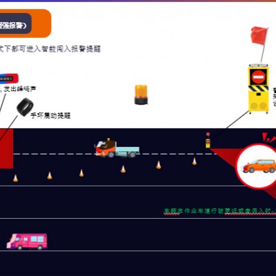 智能手环通过无线连接到摇旗声光预警主机让有车闯入施工作业区内联动肩灯/手环同时发出震动提示作业人员避让闯入车辆,降低作业风险。