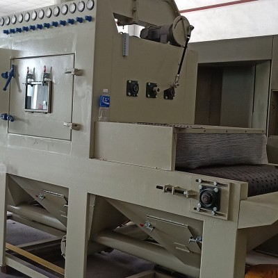 生产过程中,工件直接或装在夹具上放入输送皮带,匀速通过喷砂室;喷在电机驱动下随摆动机构作往复摆动喷砂,能保证被加工表面均匀一致,加工完毕,工件通过吹净室由风吹净表面余砂后由输送线另一端输出。