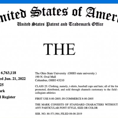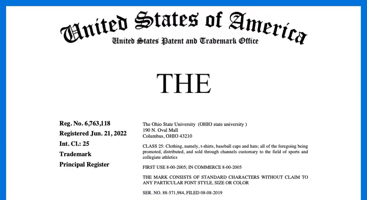 俄亥俄州立大学已成功注册“THE”商标。美国专利商标局于6月21日刚刚发布了注册。