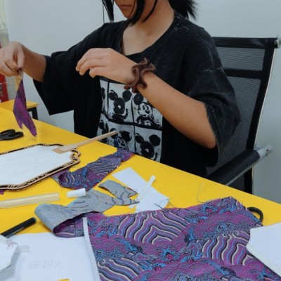 裁剪宋锦:依扇面轮廓轻绘于宋锦,裁剪时略留边幅,便于后续包边。
