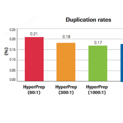 使用KAPA HyperPrep 文库构建试剂盒(绿色)或其他产品低起始量文库构建试剂盒(蓝色),2 ng cell-free DNA起始的文库获得的多样性和重复率。文库分别依照说明书构建。KAPA HyperPrep文库是使用不同的接头:插入片段摩尔比构建的。测序(2 x 150 bp)使用了llumina MiSeq®,数据分析使用了Picard。
